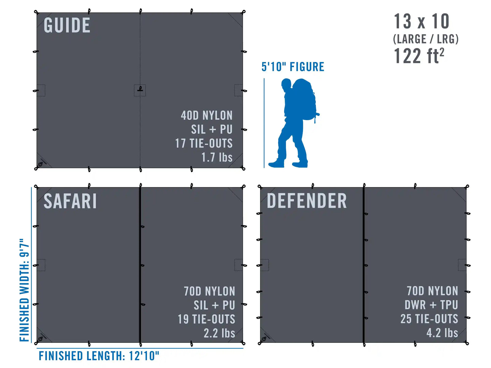 Offering up to 244 square feet of precious dry cover, our 20 x 13 (XL) tarps are ideal for deluxe set-ups and group excursions. Numerous tie-outs enable customization and stability. Can accommodate up to 8 users.