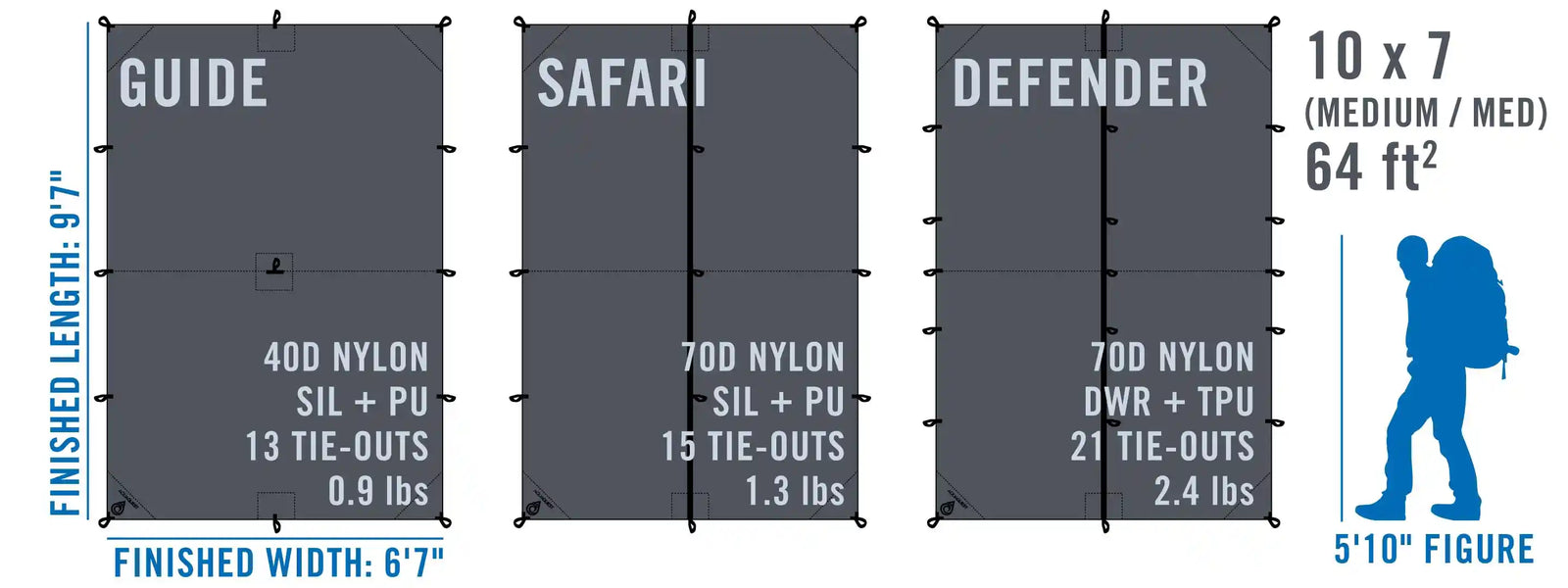 10 x 7 tarps (also referred to as Medium, or MED) are AQ's smallest tarp size and are ideal for quick and simple pitches that serve fundamental shelter needs. Can accommodate up to 2 users.
