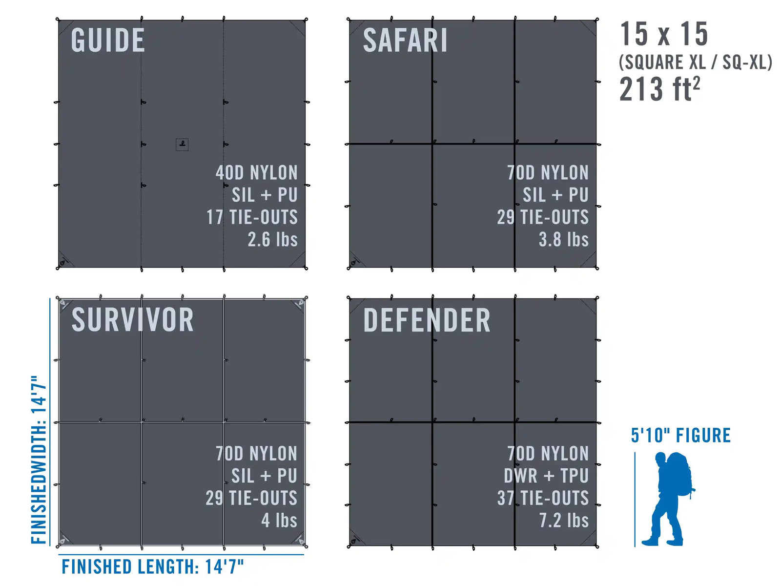 Our 15 x 15 (aka Square-XL, or SQ-XL) tarps combine massive square footage (size) with the most versatile geometry, resulting in outstanding utility in the field, even for group expeditions. Can accommodate up to 6 users.