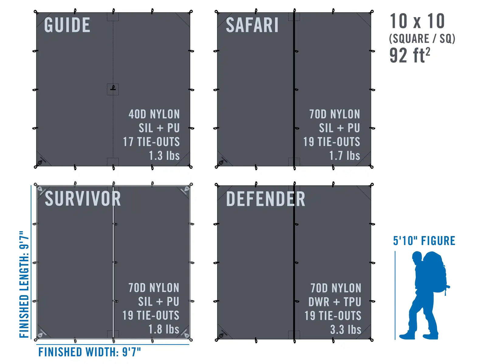 With four axes of symmetry, the 10 x 10 (aka Square, or SQ) tarp is an extremely versatile size, offering a myriad of shelter options relative to its size. Can accommodate up to 3 users.